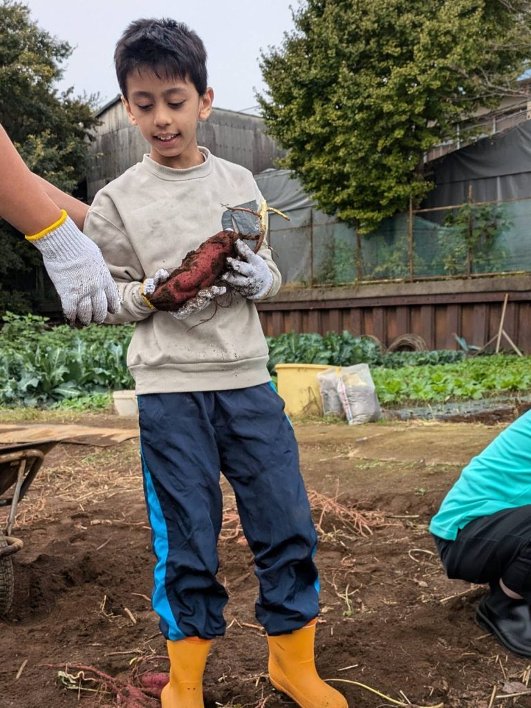 畑に到着するとAくんは手袋をはめ、早速土を掘り始めました。夢中で土を掘り進め、見事な大きないもを掘り当てることができました!